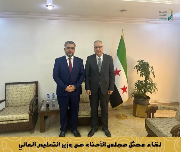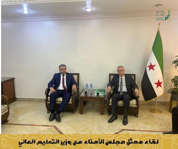 التقى اليوم الأحد بتاريخ 12/01/2025 السيد أسامة مسلم ممثل مجلس أمناء جامعة الزهراء مع سعادة الاستاذ الدكتور عبد المنعم عبد الحافظ وزير التعليم العالي والبحث العلمي في الحكومة السورية في العاصمة دمشق.
